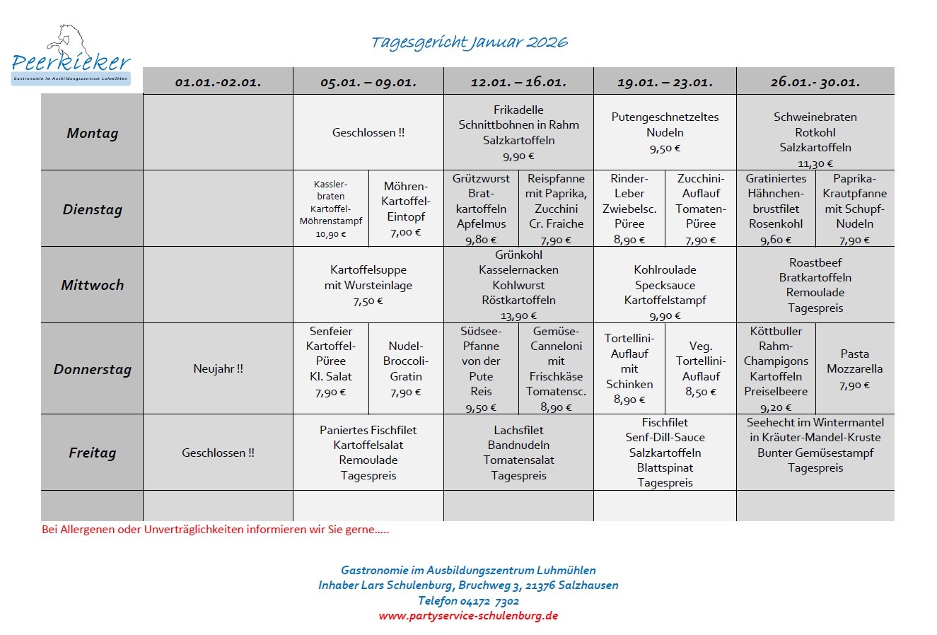 Der Peerkieker ist 5 Tage die Woche von 11:00 bis 14:00 Uhr für Sie geöffnet. Samstags stehen wir Ihnen nach Absprache für Gruppen und Vorbestellungen zur Verfügung, sonntags bleibt unser Restaurant geschlossen. Planen Sie eine private Feier oder eine Veranstaltung? Wir helfen Ihnen gerne weiter! Nehmen Sie einfach Kontakt zu uns auf und sichern Sie sich Ihren Wunschtermin. Sie erreichen uns telefonisch unter 04172/7302 oder per E-Mail, um ein individuelles Angebot anzufordern: partyservice-schulenburg@t-online.de.